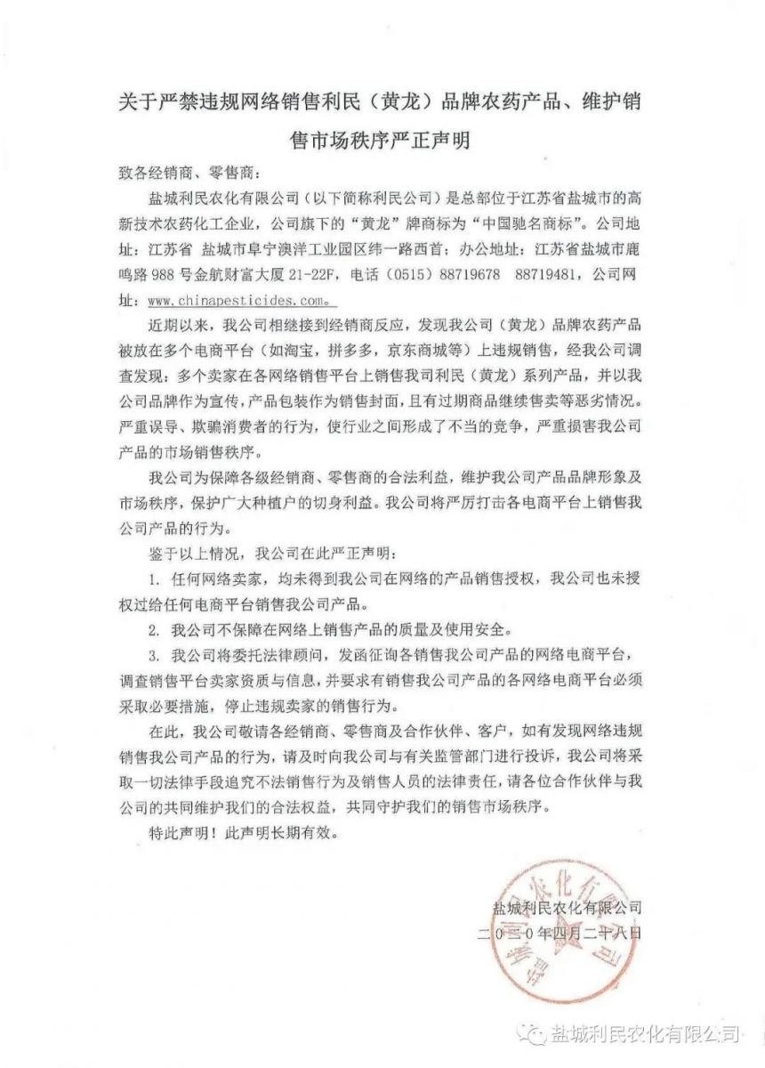 To safeguard the legitimate interests of our distributors and retailers, uphold our brand image and market order, and protect the vital interests of growers, our company will rigorously combat the unauthorised sale of our products on all e-commerce platforms. In light of the above, our company hereby solemnly declares: